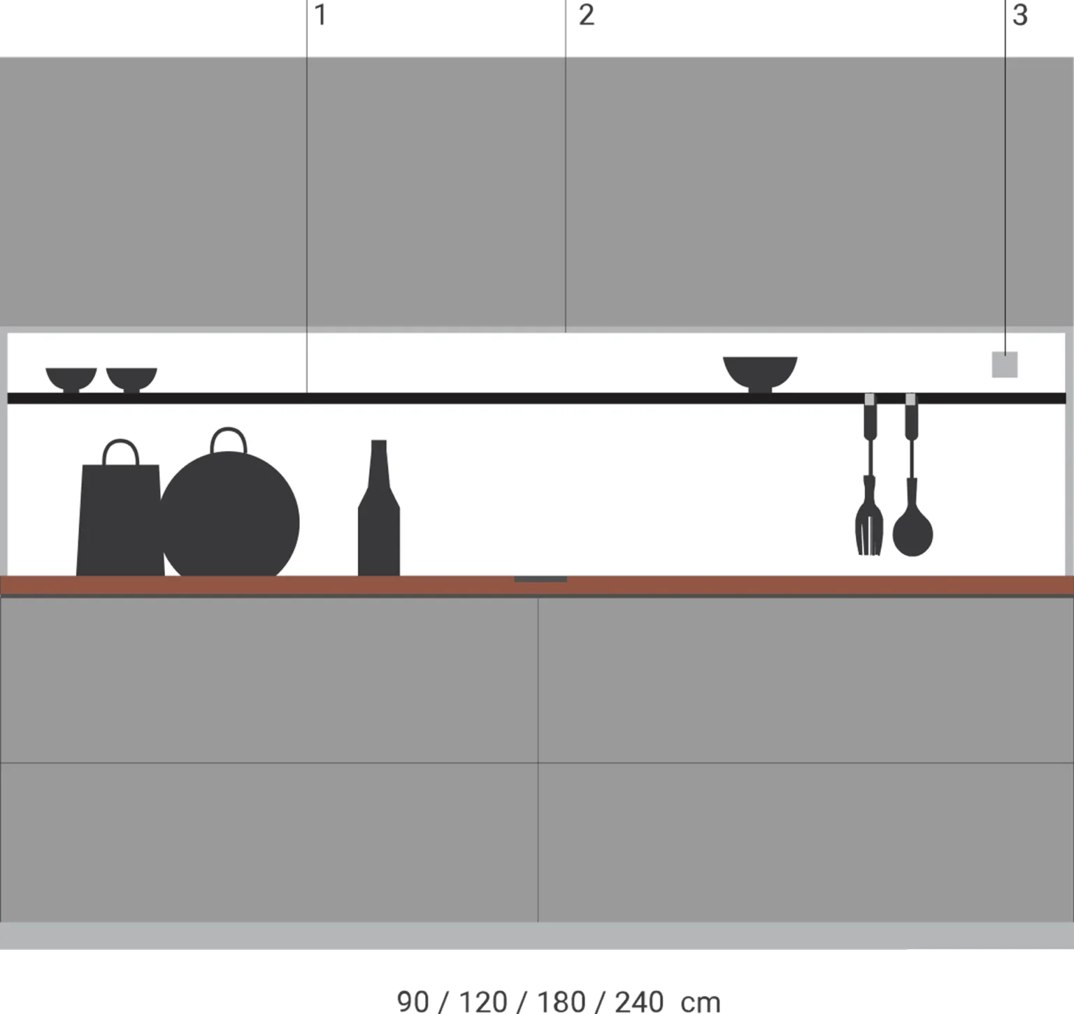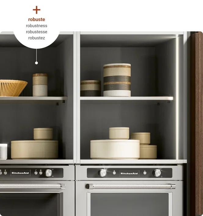 Under-wall sliding backsplash cabinets that can be adjusted in width, equipped interior (shelves, electrical outlets, and integrated ligths), and doors available in the finishes of the kitchen or worktop. Available in various depths.