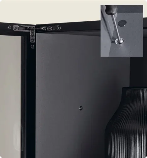 Hinges come as standard in a burnished finish; accessories are available in two versions: Basic (slate) and De Luxe (anthracite).
